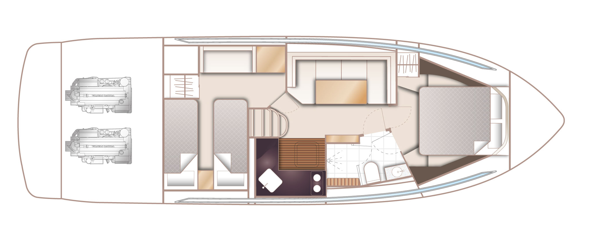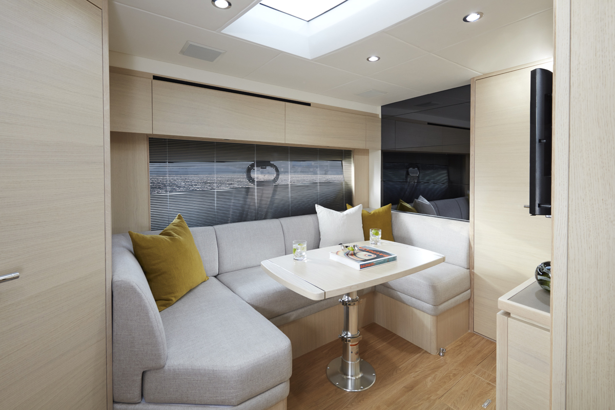 Unter Deck setzt sich die moderne Optik der V Class in der Einrichtung fort. Der geräumige Salon und die perfekt ausgestattete Kombüse bilden zusammen einen wunderbaren Unterhaltungsbereich. Die Bugkabine verfügt über ein eigenes Bad mit zweitem Zugang zum Salon, und die Achterkabine kann wahlweise mit Schiebekojen ausgestattet werden, die sich bei Bedarf mühelos zu einem Doppelbett umbauen lassen.