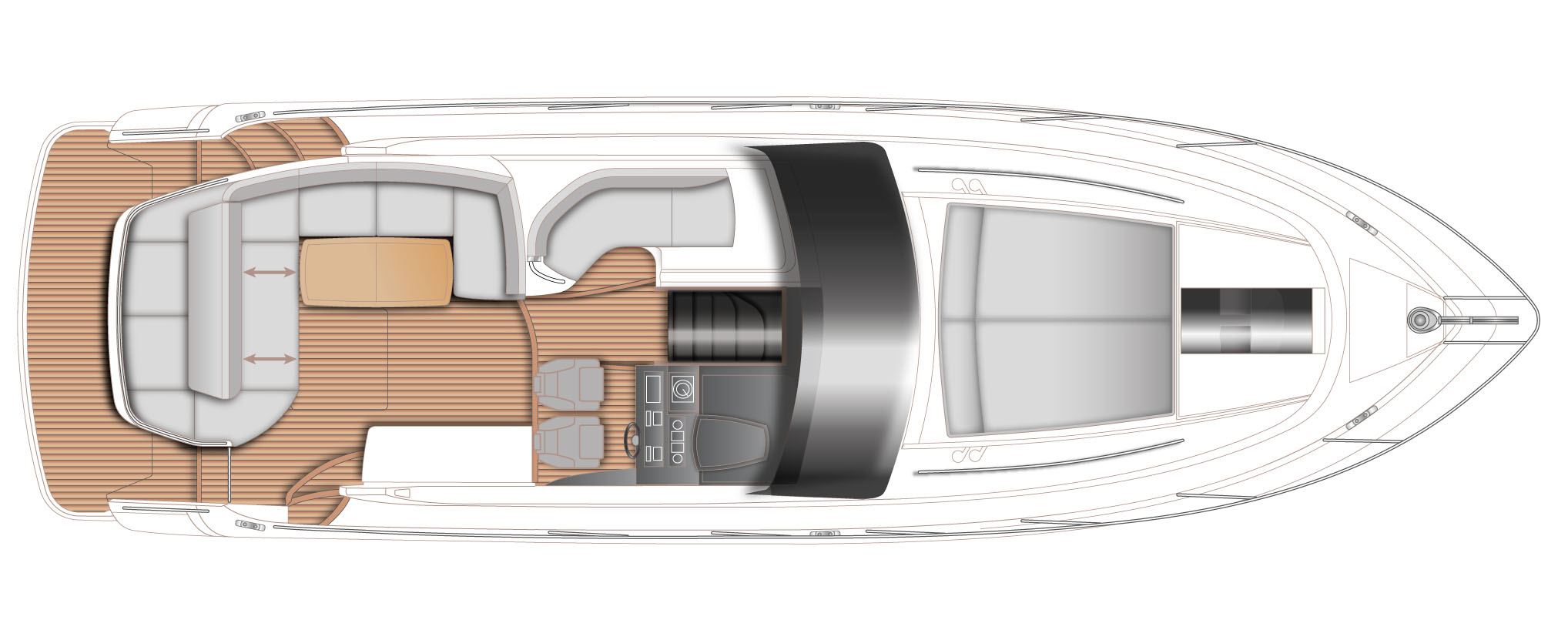 Das großzügige Cockpit mit gut ausgestatteter Wet-Bar bietet einen idealen Rahmen für unvergessliche Momente in geselliger Runde. Wahlweise kann achtern ein zusätzlicher, umbaubarer Sonnenbereich konfiguriert werden.