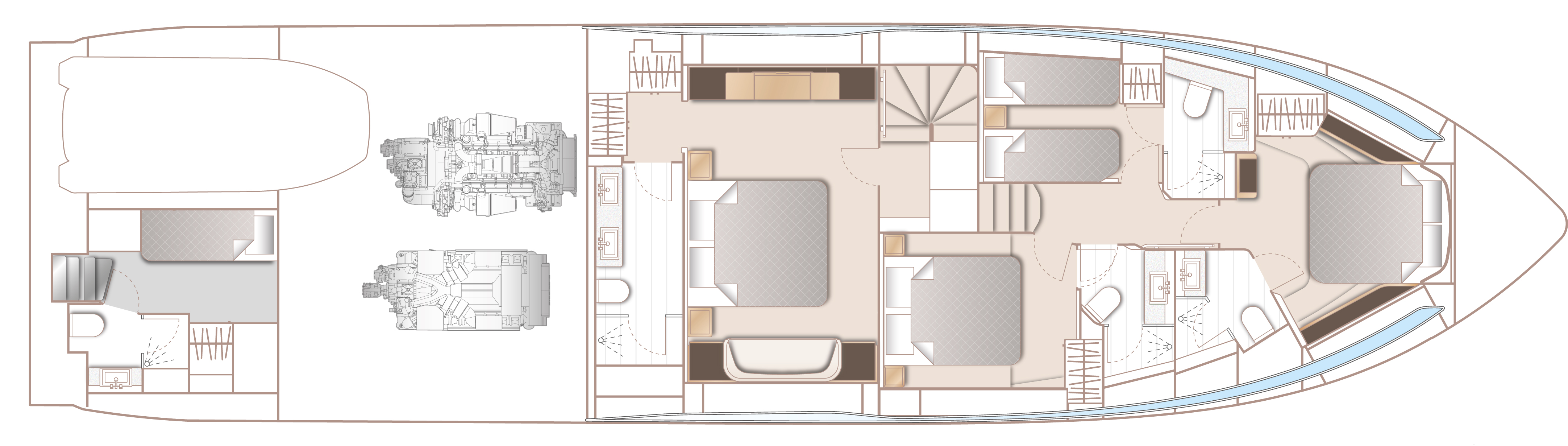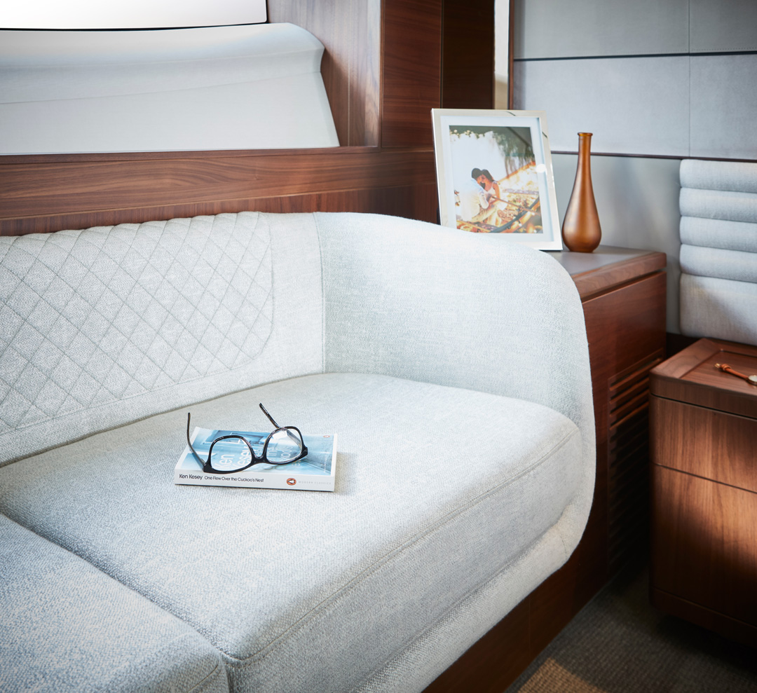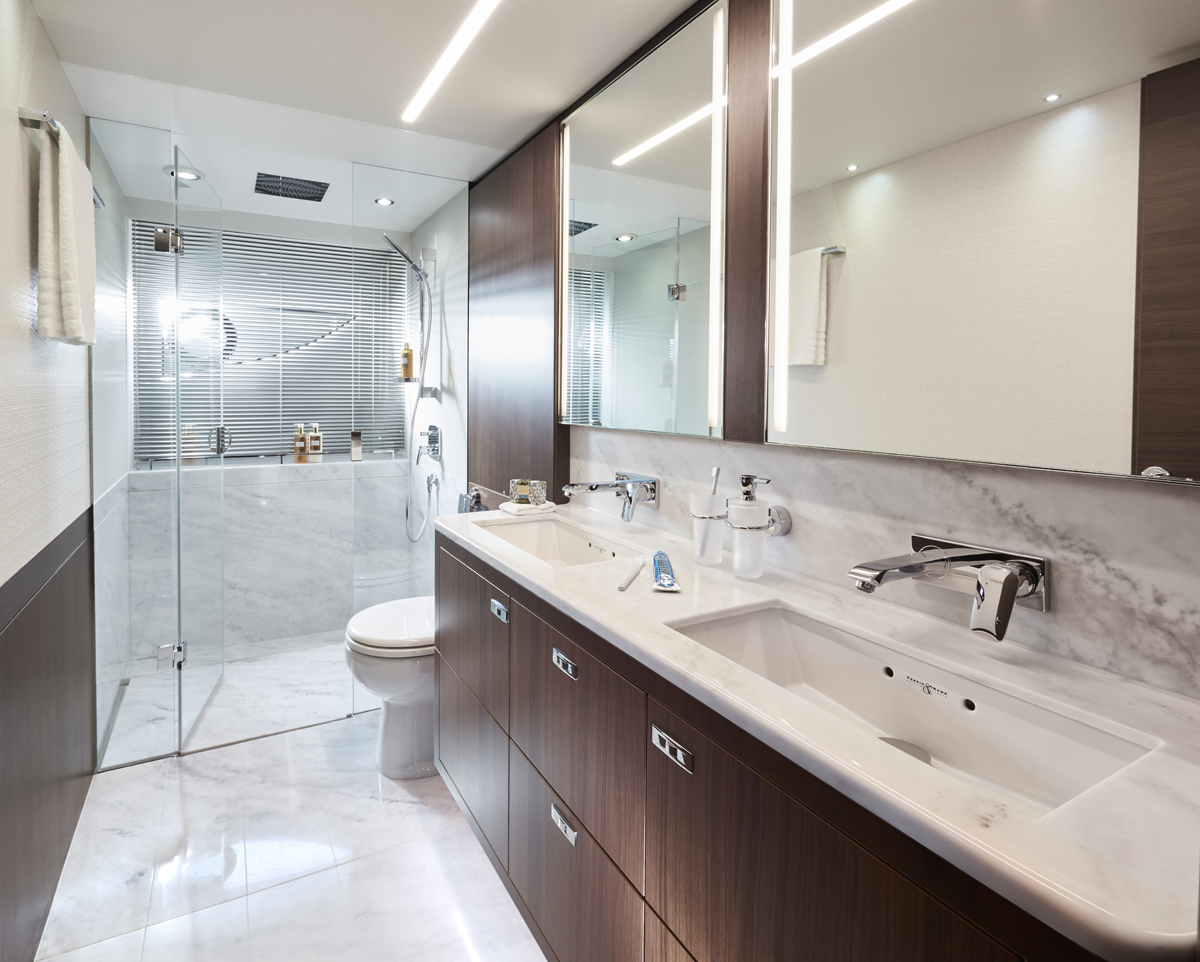 Deléitese con una nueva versión de artesanía tradicional que se manifiesta en cada rincón en su interior. La iluminación ambiental armoniza con el mobiliario, los paneles decorativos y los suelos. Su amplísimo salón en la cubierta principal se funde con el exterior a través de sus ventanales laterales de longitud completa. Le sorprenderán su cocina perfectamente equipada y su comedor de gran versatilidad gracias su ingeniosa mesa corrediza de cristal. Bajo cubierta, hasta ocho invitados pueden disfrutar de las cabinas con baño en suite y un equipamiento excepcional, donde no falta la luz natural proveniente del