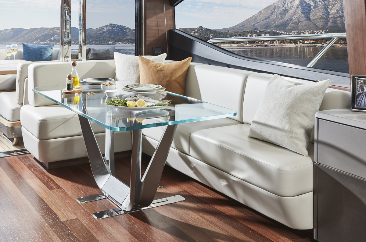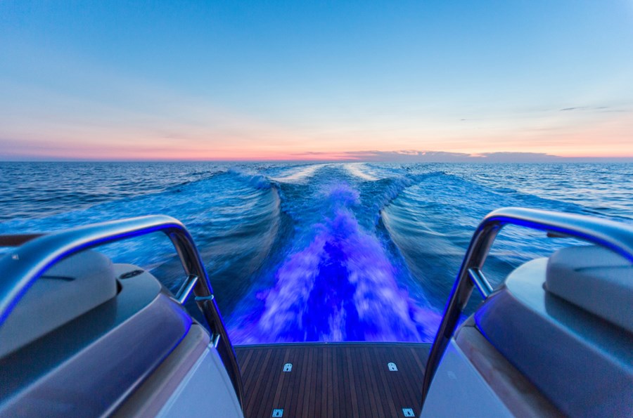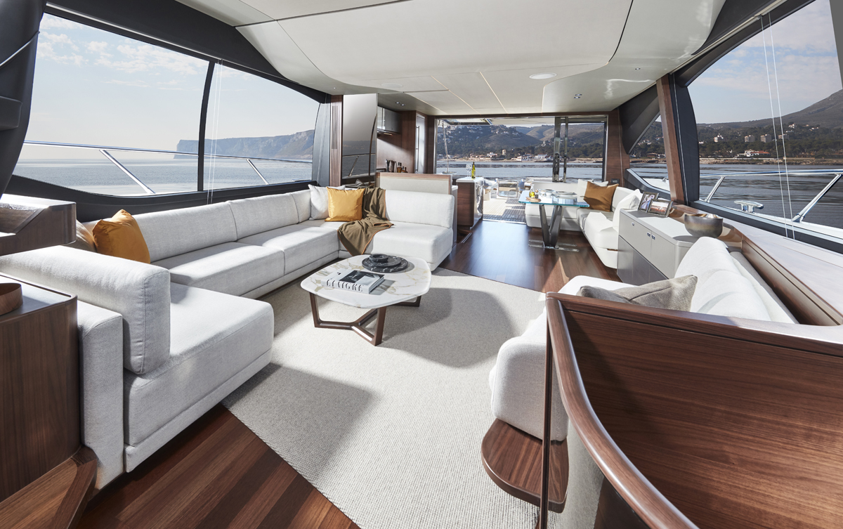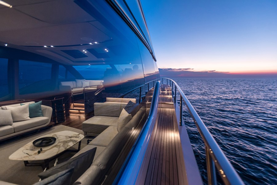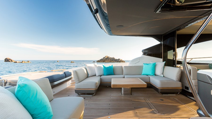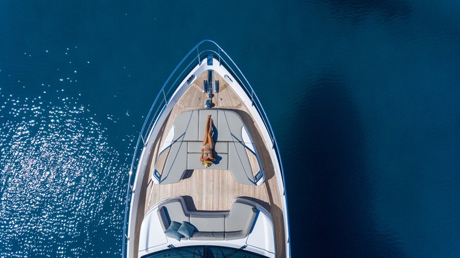 Su puente deportivo es una invitación irresistible para relajarse con opciones exclusivas de mobiliario y una zona de asientos que se convierten en tumbonas. Su acceso central único a la bañera desde su plataforma de baño hidráulica pasa entre dos tumbonas, mientras que su cubierta de proa cuenta con unos innovadores asientos con tumbonas que se pueden transformar en asientos adicionales orientados hacia la popa. Ponen el ambiente perfecto a su travesía su puente deportivo, su salón, su bañera y su camarote principal, donde eleva la experiencia el insuperable sistema de sonido NAIM, el cual viene equipado de serie.