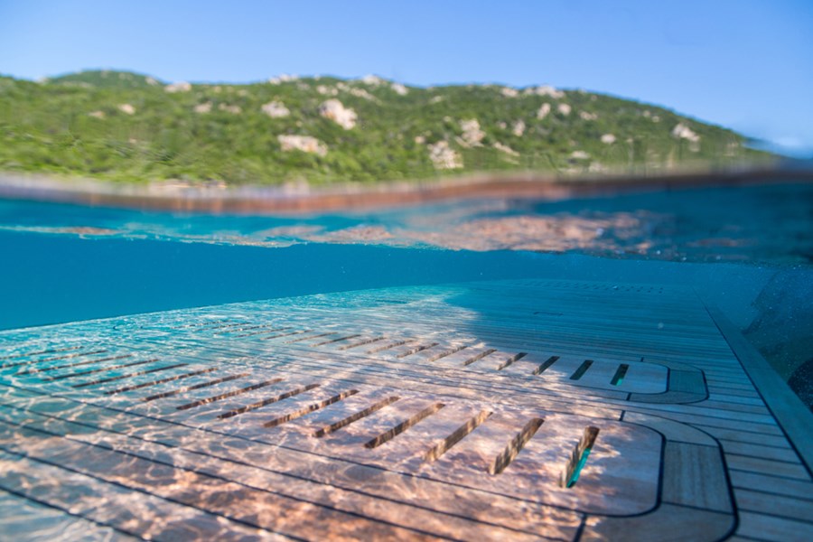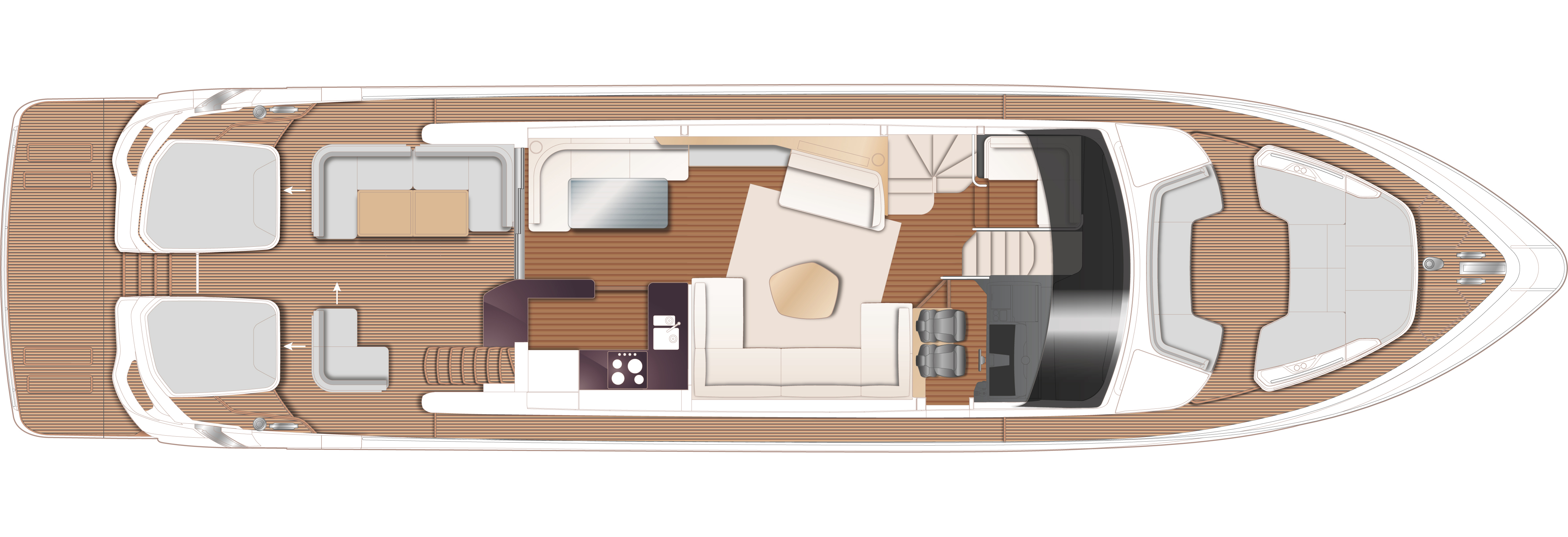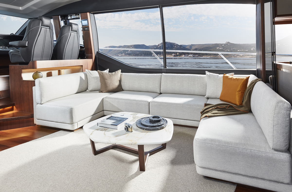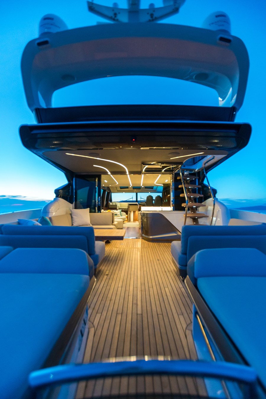 Su puente deportivo es una invitación irresistible para relajarse con opciones exclusivas de mobiliario y una zona de asientos que se convierten en tumbonas. Su acceso central único a la bañera desde su plataforma de baño hidráulica pasa entre dos tumbonas, mientras que su cubierta de proa cuenta con unos innovadores asientos con tumbonas que se pueden transformar en asientos adicionales orientados hacia la popa. Ponen el ambiente perfecto a su travesía su puente deportivo, su salón, su bañera y su camarote principal, donde eleva la experiencia el insuperable sistema de sonido NAIM, el cual viene equipado de serie.