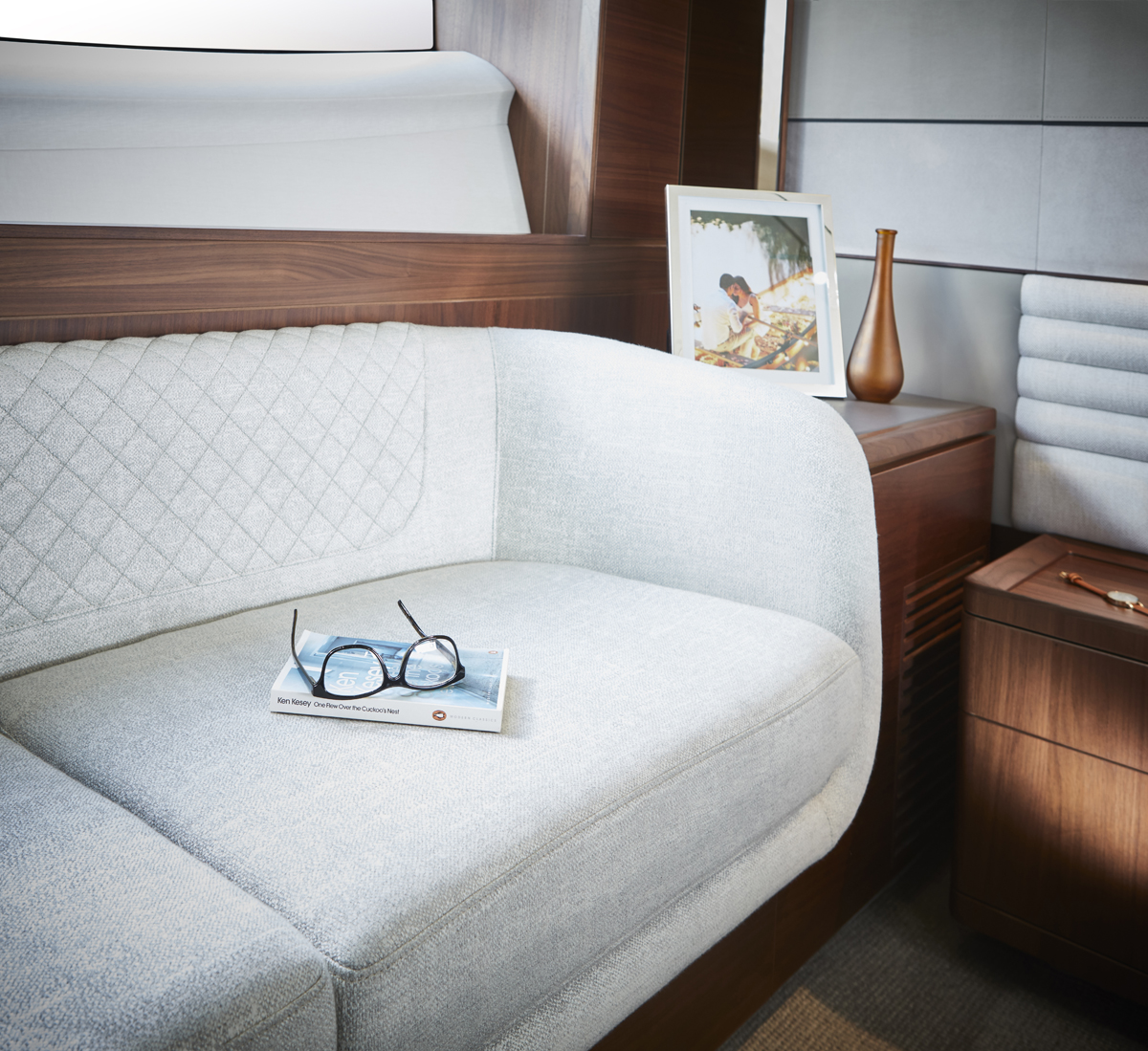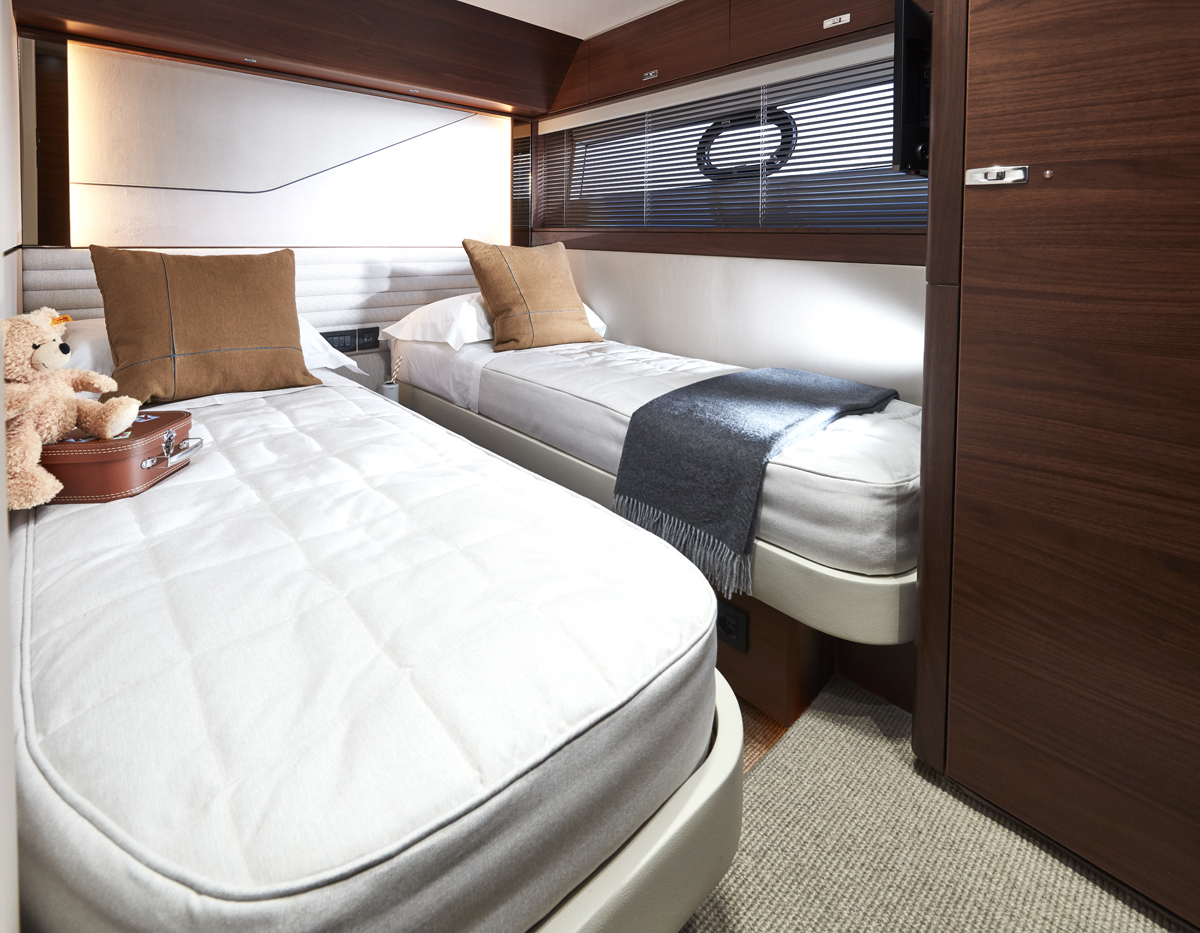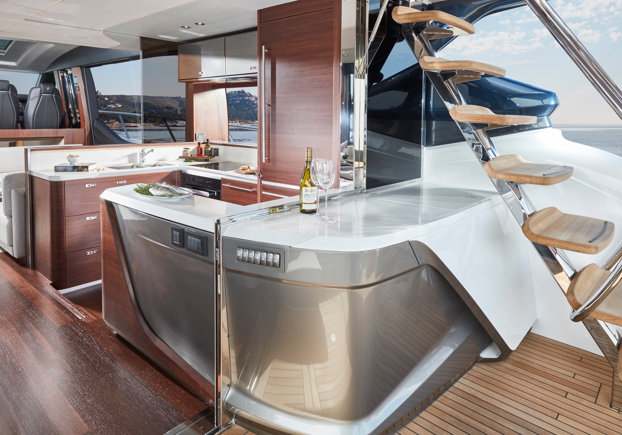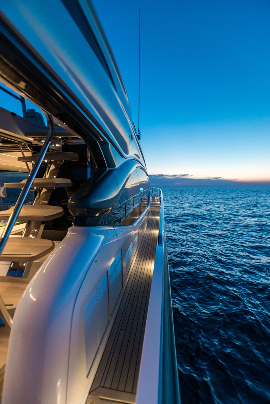 Su puente deportivo es una invitación irresistible para relajarse con opciones exclusivas de mobiliario y una zona de asientos que se convierten en tumbonas. Su acceso central único a la bañera desde su plataforma de baño hidráulica pasa entre dos tumbonas, mientras que su cubierta de proa cuenta con unos innovadores asientos con tumbonas que se pueden transformar en asientos adicionales orientados hacia la popa. Ponen el ambiente perfecto a su travesía su puente deportivo, su salón, su bañera y su camarote principal, donde eleva la experiencia el insuperable sistema de sonido NAIM, el cual viene equipado de serie.
