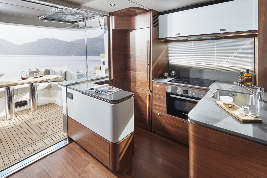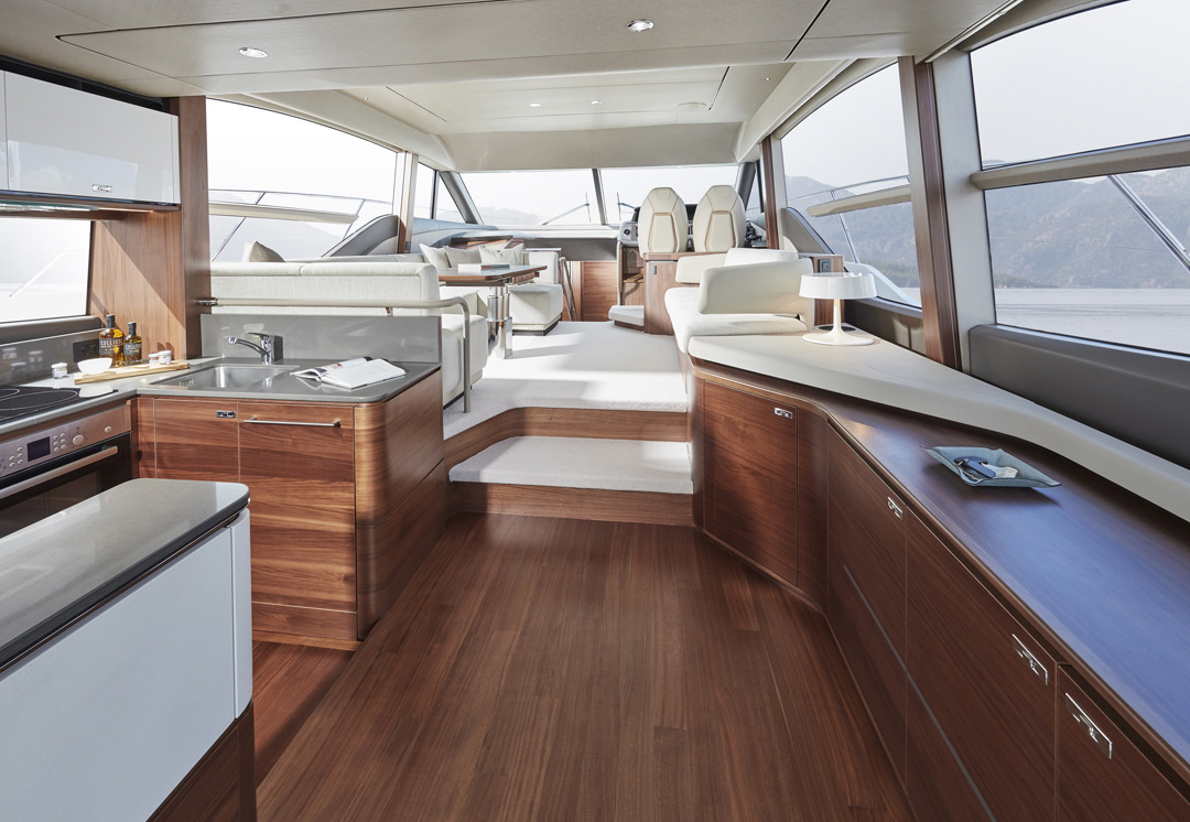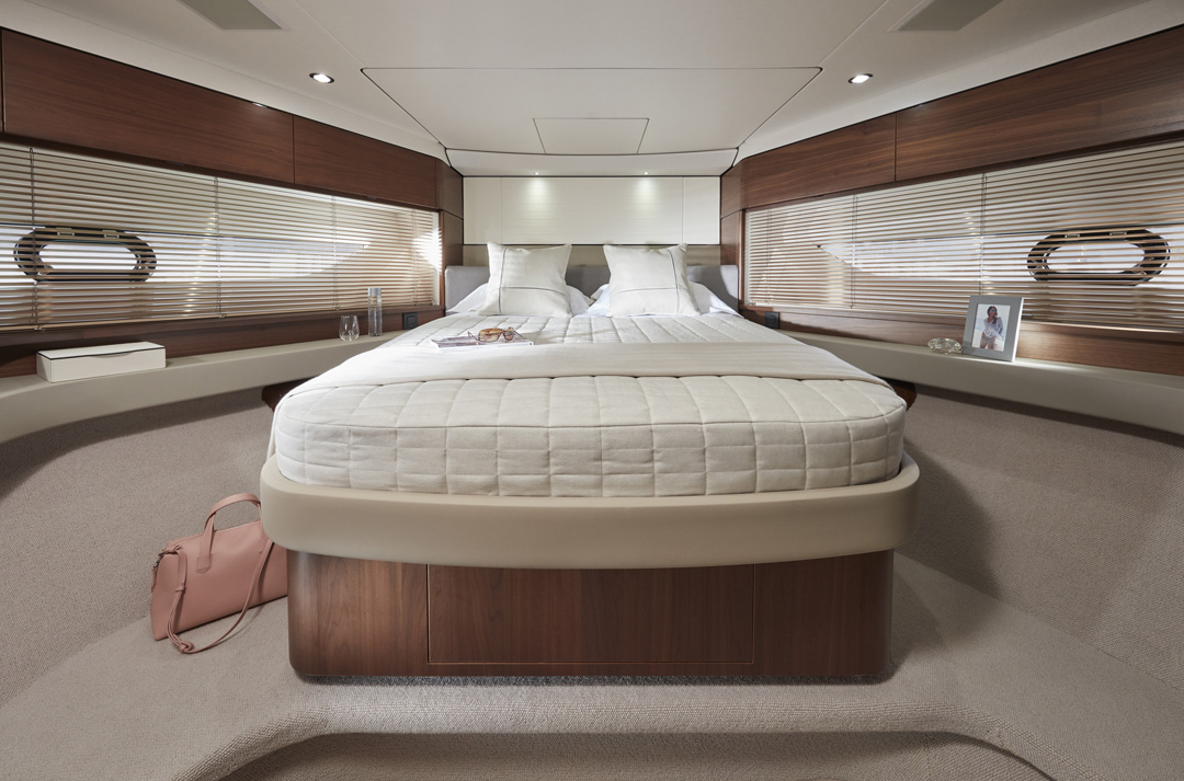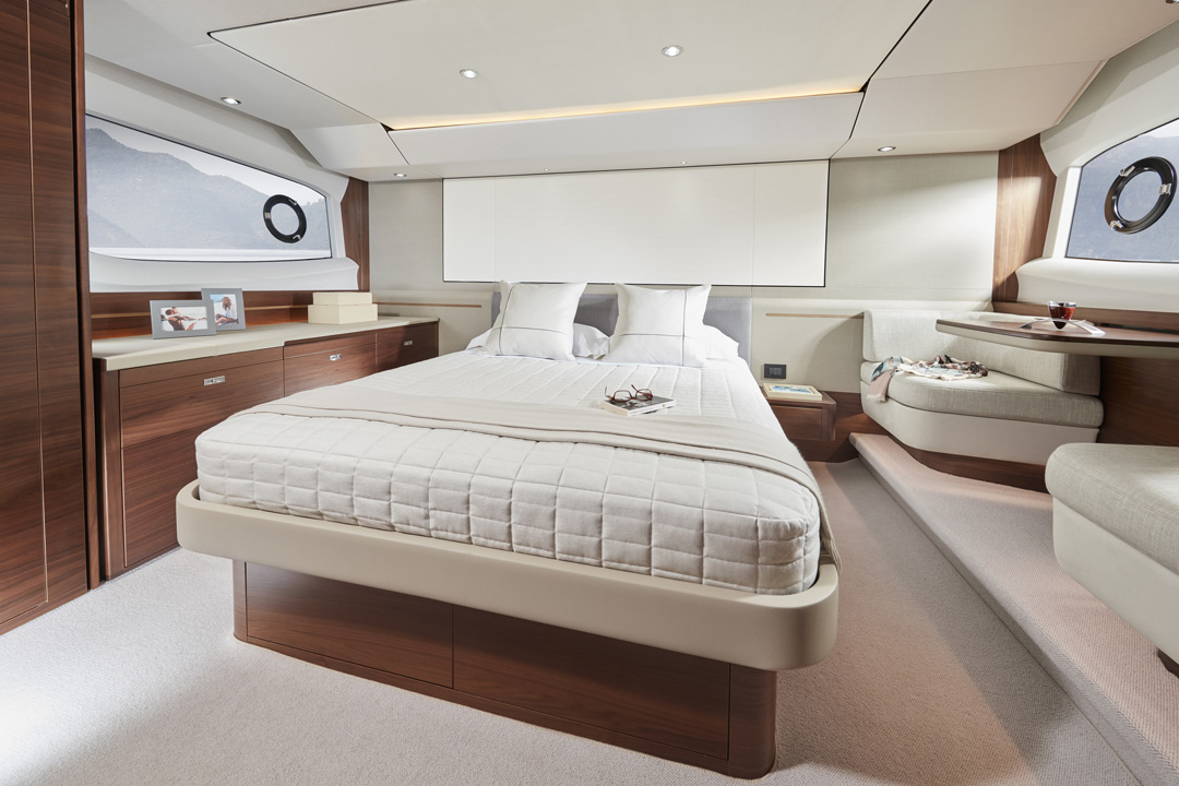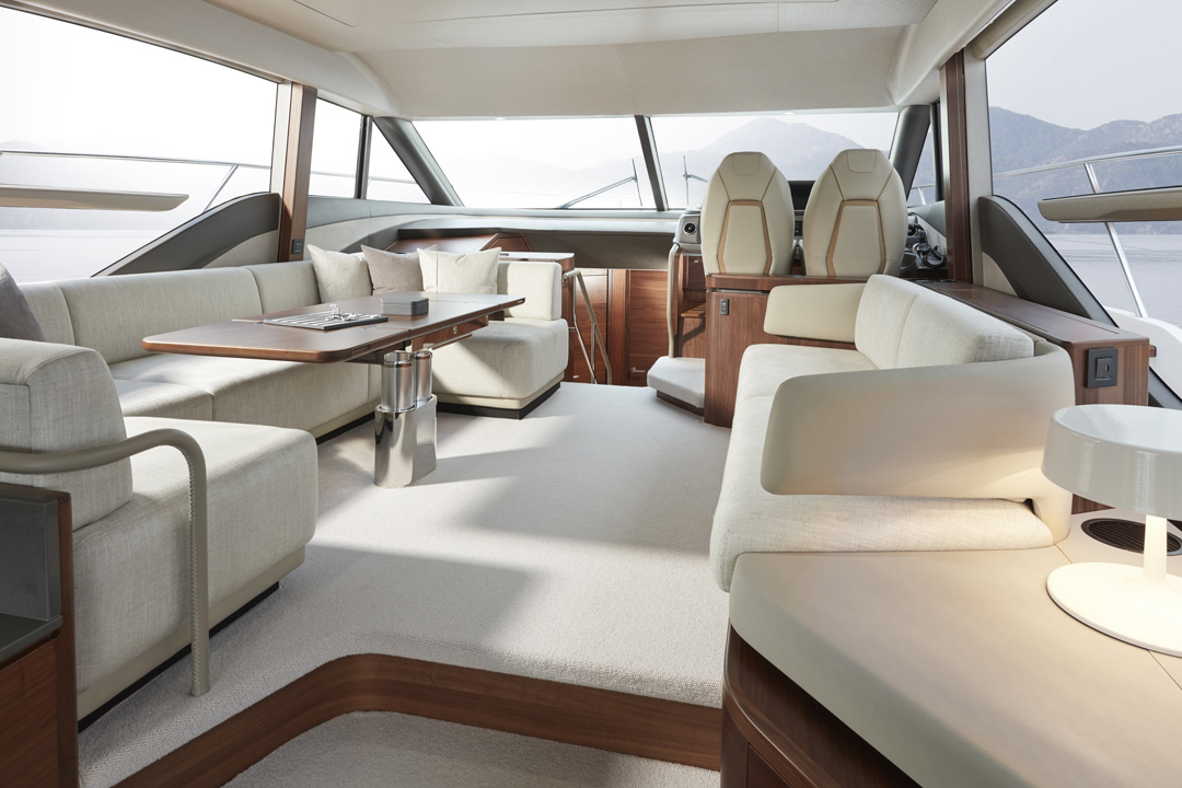 The F55 interior has an architectural presence and elegantly uses contrasting surfaces whilst retaining the elegance that Princess interiors are renowned for.