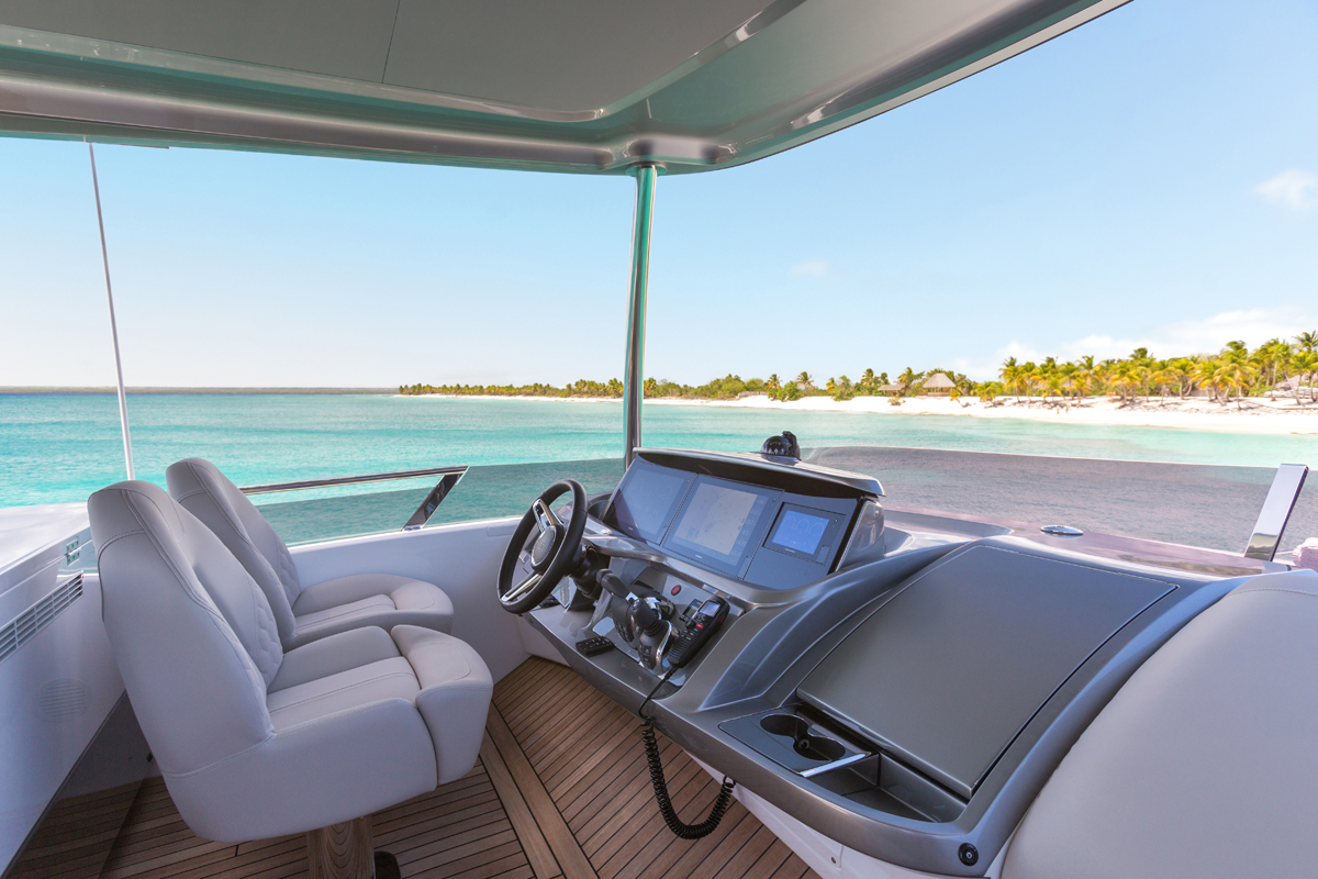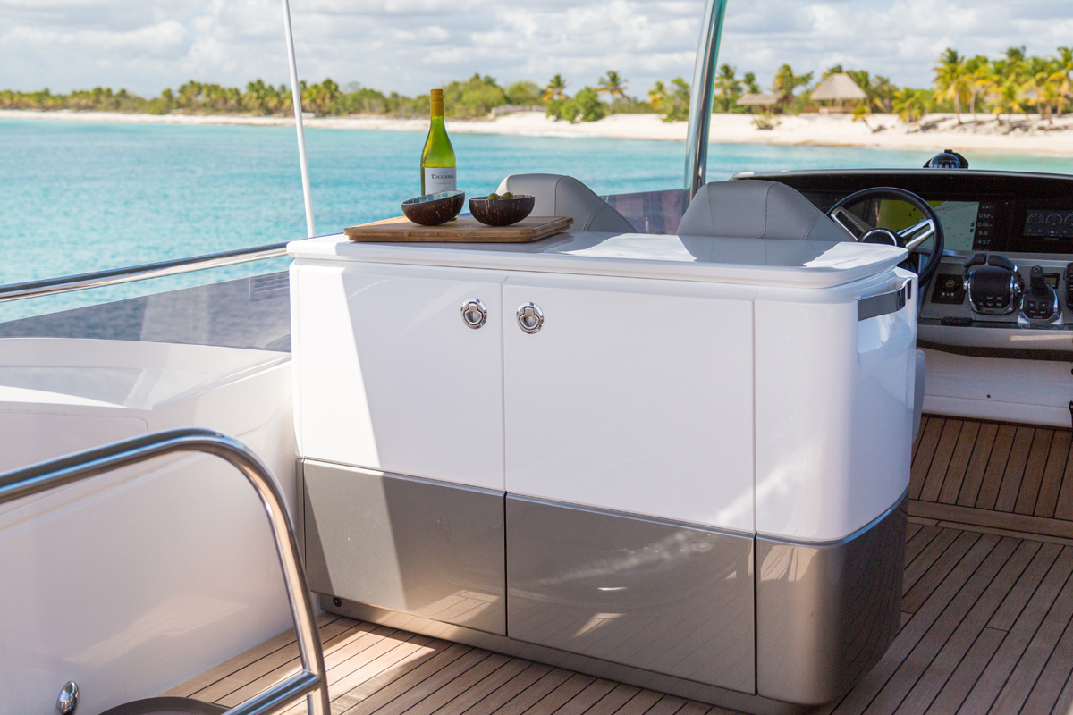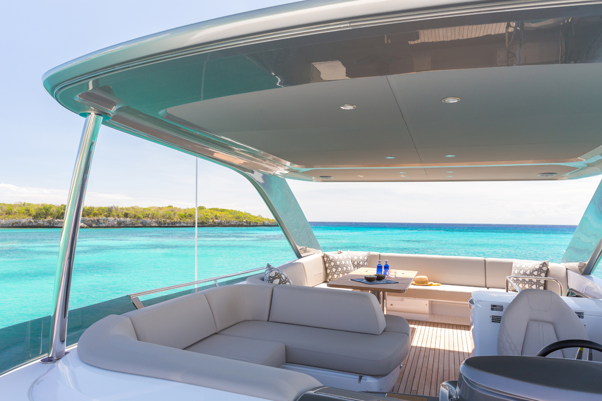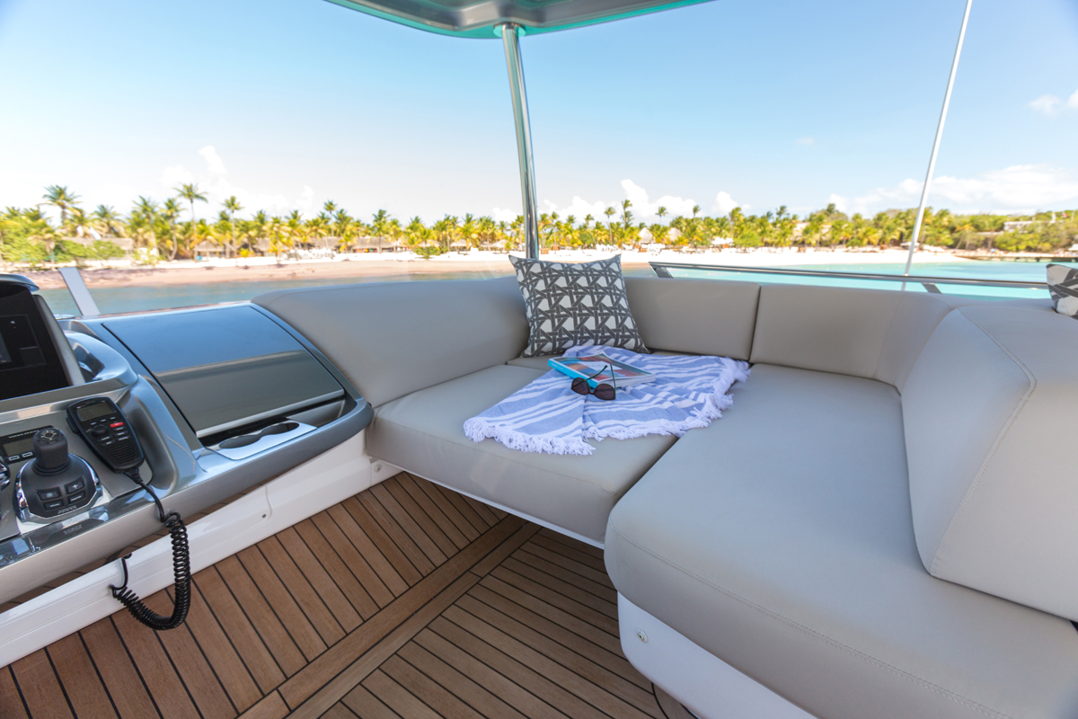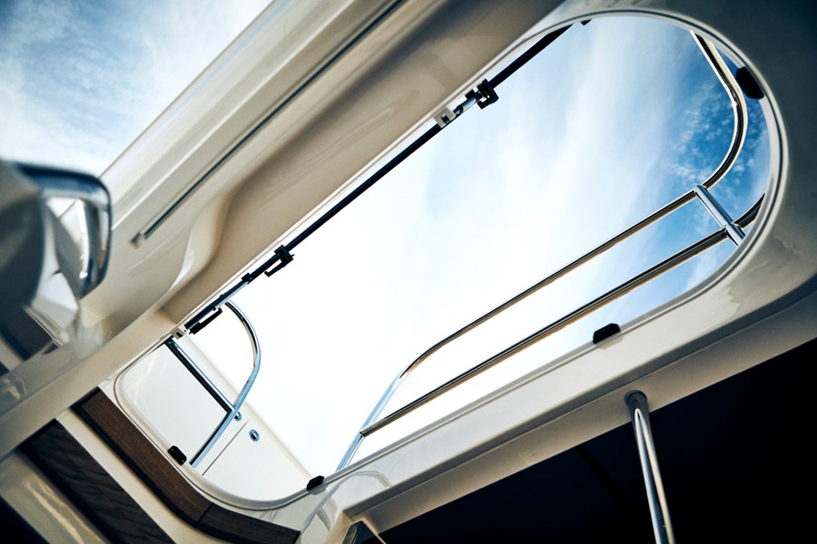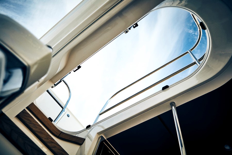 The award-winning Princess F55's 17.80m2 flybridge enjoys a convertible sunbed, twin helm seats, a wetbar and ergonomic dining areas. Vast panoramic saloon windows and signature wrap around front screens offer uninterrupted vistas from the main deck whilst expansive hull windows generously flood her accommodation areas with light.