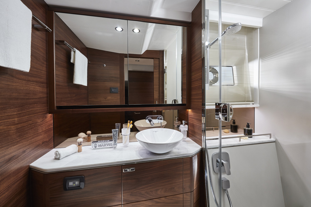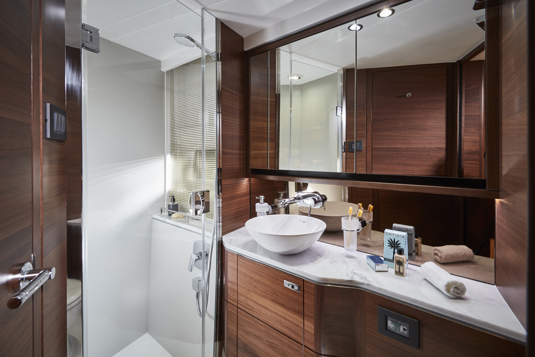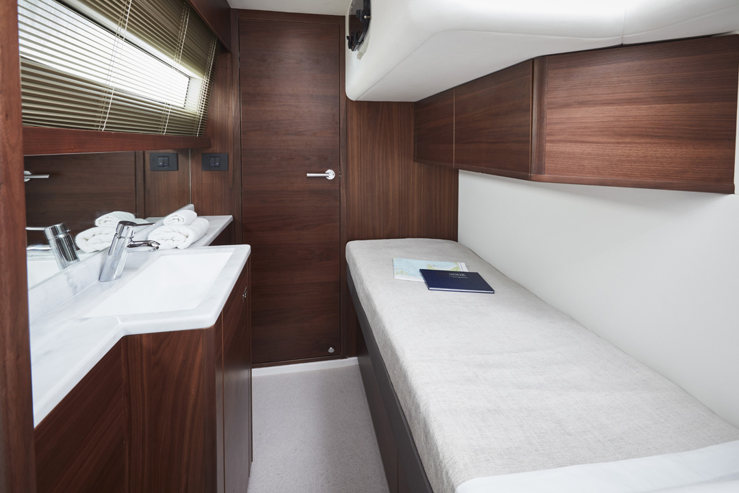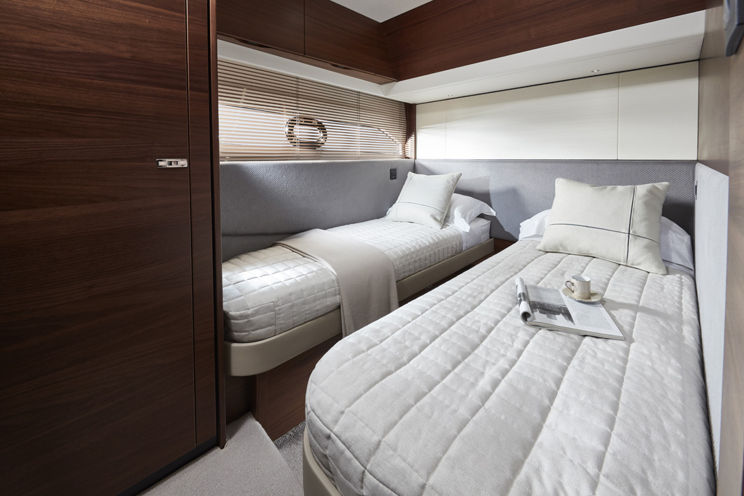 The F55 interior has an architectural presence and elegantly uses contrasting surfaces whilst retaining the elegance that Princess interiors are renowned for. Her spacious saloon features a U-shaped sofa opposite a twin sofa with the option of a folding leaf dining or coffee table in between. Below, both the master stateroom and forward cabin feature large double beds whilst the starboard guest cabin with two single beds can also be converted into a double. There is also the option for a single bed aft cabin.