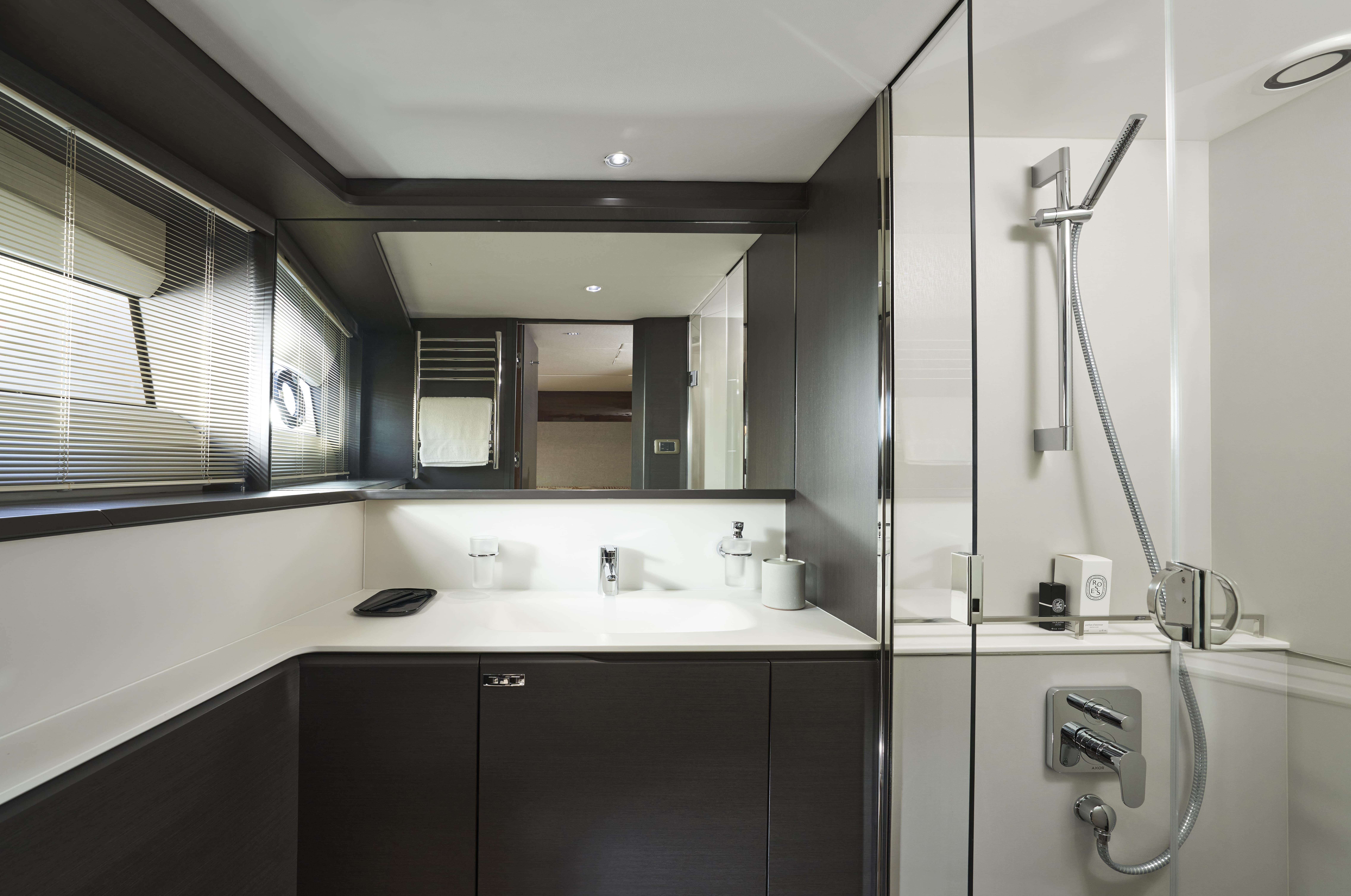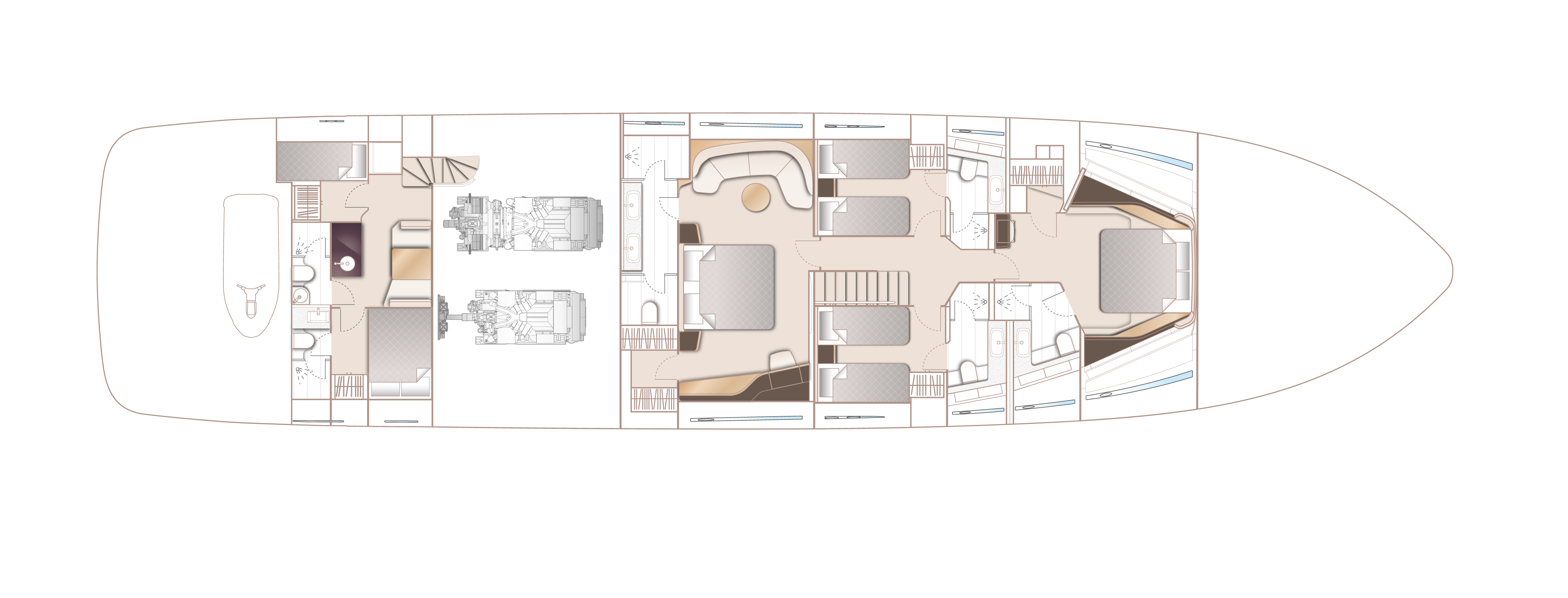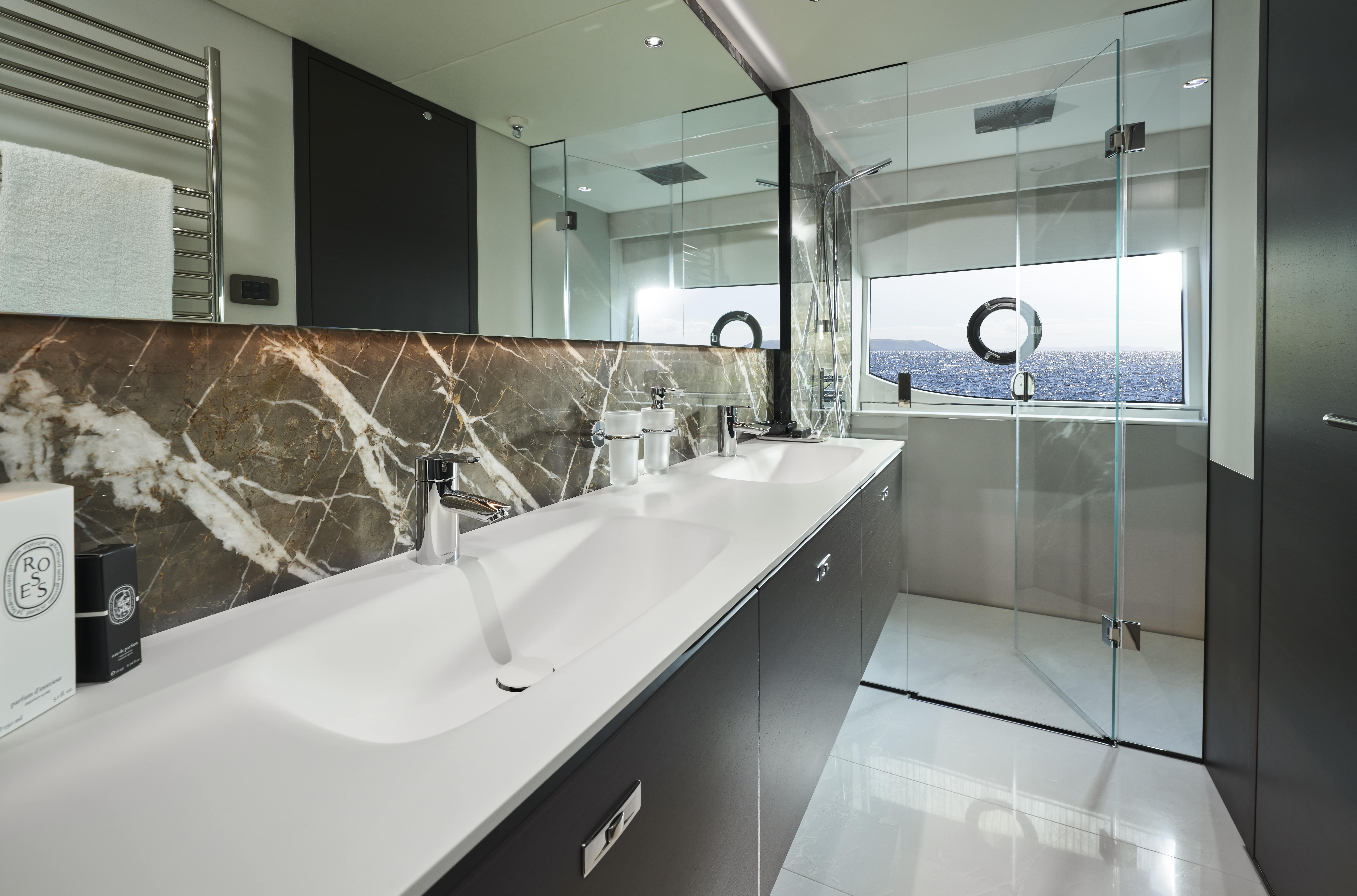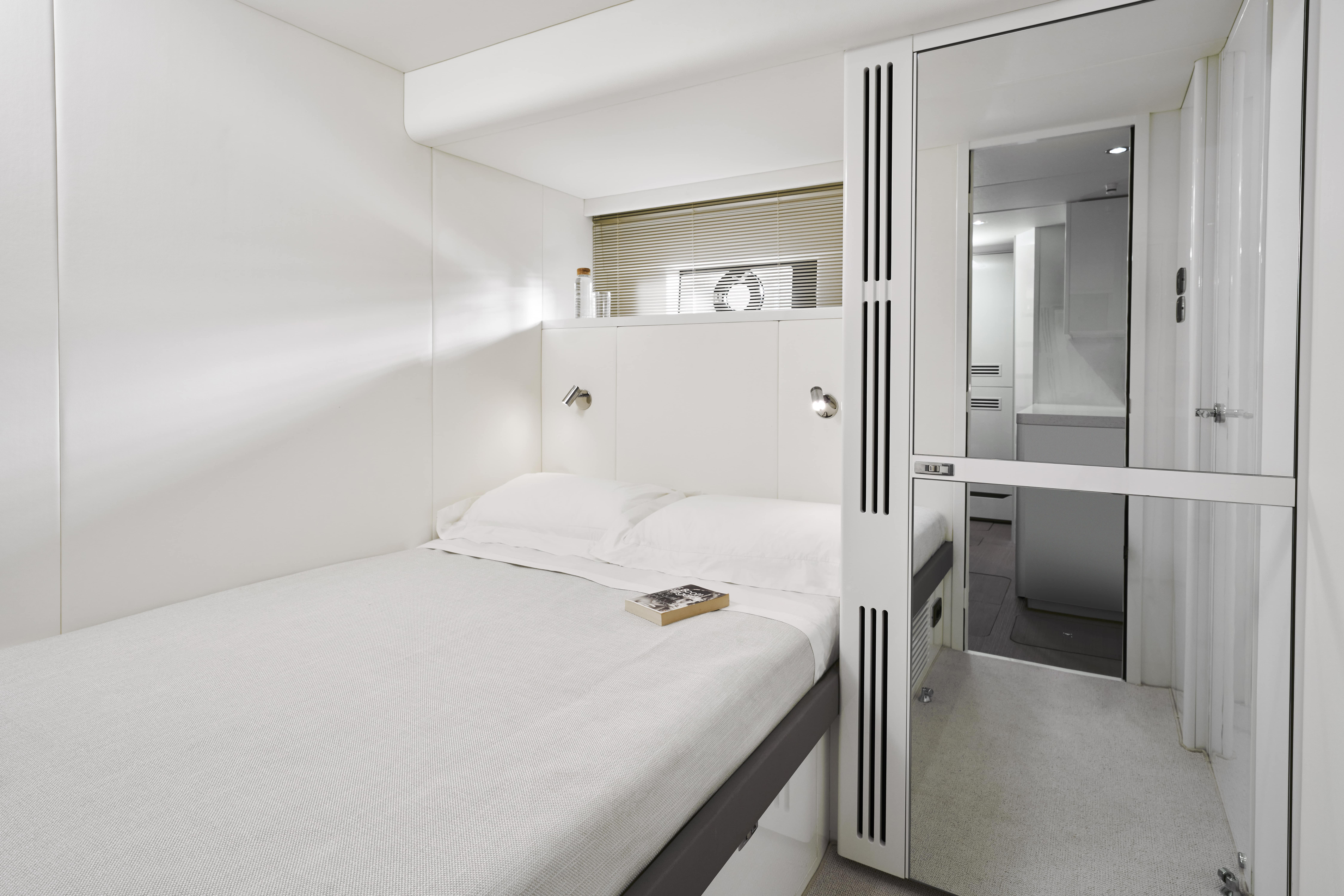 Experience space akin to a megayacht as you enter her main deck saloon and witness a line of sight right through to the forward window. Ascend the internal staircase to the upper deck and another unique experience awaits: a fully enclosed and climate-controlled Sky Lounge. Taking pride of place on her lower deck is the full beam Master Stateroom with en suite, complemented by her Forward Stateroom with walk-in wardrobe and en suite bathroom. Additional port and starboard guest cabins can each be configured with two single beds or one double bed, whilst generous crew quarters complete her extensive accommodation.